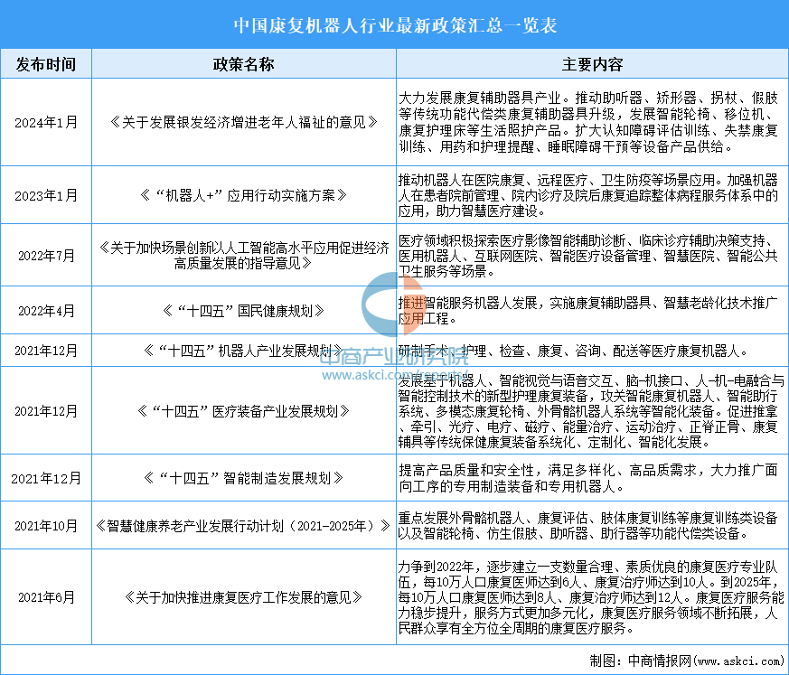 近年來,中國政府相關(guān)部門出臺了一系列政策,鼓勵和支持康復(fù)機器人產(chǎn)業(yè)的發(fā)展。例如,《關(guān)于發(fā)展銀發(fā)經(jīng)濟增進(jìn)老年人福祉的意見》提出大力發(fā)展康復(fù)輔助器具產(chǎn)業(yè),《“機器人+”應(yīng)用行動實施方案》提出推動機器人在醫(yī)院康復(fù)、遠(yuǎn)程醫(yī)療、衛(wèi)生防疫等場景應(yīng)用,《“十四五”國民健康規(guī)劃》進(jìn)一步鼓勵智能服務(wù)機器人發(fā)展,實施康復(fù)輔助器具、智慧老齡化技術(shù)推廣應(yīng)用工程。政策的發(fā)布和實施將為康復(fù)機器人行業(yè)的發(fā)展提供了明確、廣闊的市場前景,為企業(yè)提供了良好的生產(chǎn)經(jīng)營環(huán)境。