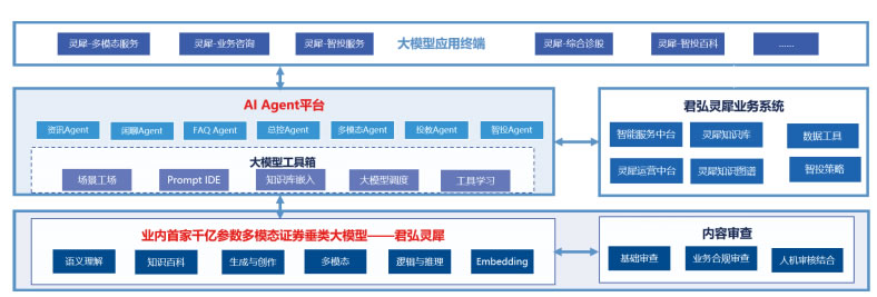 君弘靈犀大模型以多模態(tài)大模型能力和君弘智投服務(wù)體系為核心,以靈犀知識(shí)庫(kù)和智能服務(wù)配置中臺(tái)為基礎(chǔ),以Agent平臺(tái)為總控,以靈活產(chǎn)品形態(tài)輸出至多渠道終端。結(jié)合面向基礎(chǔ)長(zhǎng)尾客群的君弘智投服務(wù)體系,打造有證券特色的大模型應(yīng)用場(chǎng)景,涵蓋君弘智投、綜合診斷、智能選股、熱點(diǎn)資訊、多模態(tài)處理等十大功能,不僅解決了傳統(tǒng)模型在語(yǔ)義理解、多輪對(duì)話和答案豐富性上表現(xiàn)不佳、運(yùn)營(yíng)成本G、投資服務(wù)匹配度低等嚴(yán)重影響用戶體驗(yàn)和服務(wù)效率的問(wèn)題,更以全新的交互模式和強(qiáng)大的能力底座為海量用戶提供廣譜式、伴隨式的智能化服務(wù)。
