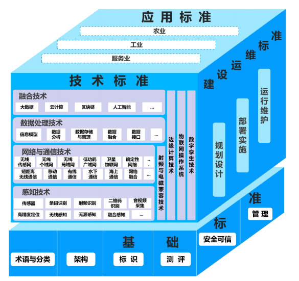 物聯(lián)網(wǎng)標準體系包括基礎(chǔ)標準、技術(shù)標準、建設(shè)運維標準和應(yīng)用標準等4個部分,見圖1;A(chǔ)標準是物聯(lián)網(wǎng)的總體性、框架性標準,為其他各類標準提供基礎(chǔ)支撐;技術(shù)標準是物聯(lián)網(wǎng)的關(guān)鍵共性技術(shù)與融合技術(shù)標準,為實現(xiàn)物聯(lián)網(wǎng)應(yīng)用提供技術(shù)支撐;建設(shè)運維標準是物聯(lián)網(wǎng)系統(tǒng)規(guī)劃、建設(shè)、運行、維護的標準,以指導(dǎo)各行業(yè)推進物聯(lián)網(wǎng)系統(tǒng)建設(shè)和規(guī);渴饝(yīng)用;應(yīng)用標準是面向行業(yè)具體應(yīng)用需求,對其它部分標準的細化,支撐各行業(yè)發(fā)展。