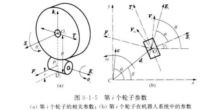在不考慮運(yùn)動(dòng)性能的情況下,全方位輪可以以任意角度安裝在機(jī)器人本體上, 圖3-1-5(b) 所示。其中,機(jī)器人中心C 到輪子中心O. 的矢量為d.,d, 與 x 軸的夾 角為β.輪轂轉(zhuǎn)速負(fù)方向S, 與r 軸夾角為γ,。以上各參數(shù)確定后,全方位輪的安裝 方式便可以確定。