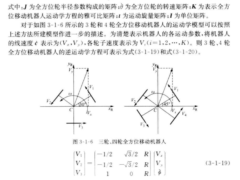 具有傳統(tǒng)車輪的機(jī)器人只能有兩個(gè)自由度的運(yùn)動(dòng),所以在運(yùn)動(dòng)學(xué)上,它等價(jià)于 傳統(tǒng)的陸上車輛。然而,具有全方位輪的機(jī)器人有3個(gè)自由度運(yùn)動(dòng)的能力,即沿著 平面上x 軸、y 軸以及繞自身中心旋轉(zhuǎn)的運(yùn)動(dòng)能力,這充分增加了機(jī)器人的機(jī)動(dòng) 性。本節(jié)將給出這種全方位移動(dòng)機(jī)器人的運(yùn)動(dòng)學(xué)模型。