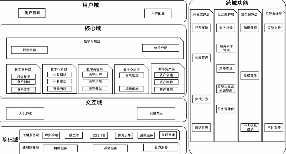 元宇宙系統(tǒng)架構(gòu)可劃分為四個(gè)功能域和跨域功能(見圖1),包括: