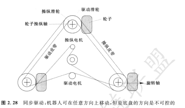 在室內(nèi)移動機(jī)器人應(yīng)用中,同步驅(qū)動結(jié)構(gòu)(圖2.28)是一種流行的輪子裝配,也是 一個令人很感興趣的結(jié)構(gòu)。因?yàn)樗m然有3個驅(qū)動和操縱輪,可是總共只用了2個電機(jī)。一個平移電機(jī)設(shè)置3個輪子一起的速度; 一個操縱電機(jī),使所有輪子繞著它們 各自的垂直操縱軸一起旋轉(zhuǎn)。但要注意的是,輪子是相對于機(jī)器人的底盤受操縱的, 所以,沒有直接方法重新設(shè)定機(jī)器人底盤的方向。實(shí)際上,由于凹凸不平輪胎的滑動,在整個時間里底盤方向一定會漂移,造成旋轉(zhuǎn)的航位測定誤差。
