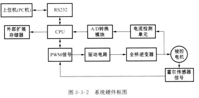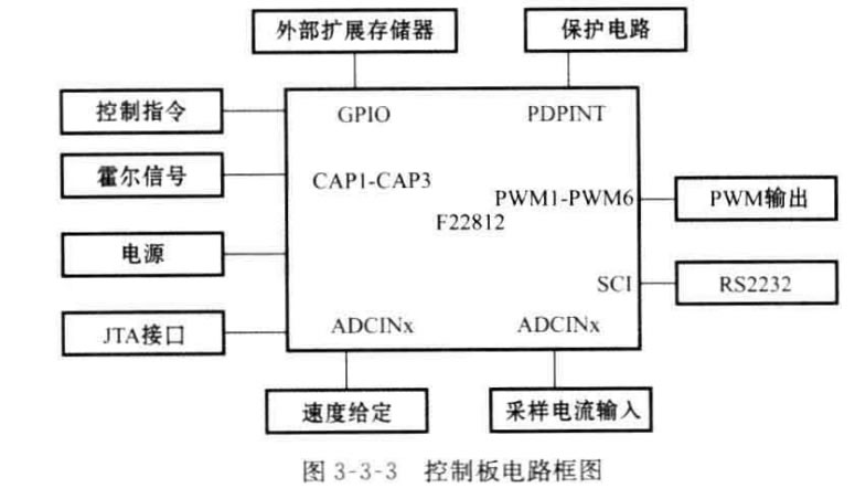 系統(tǒng)的硬件框圖如圖3-3-2所示,可以看出基本上包括一個(gè)以TMS320F2812DSP 為核心的DSP 控制板,一塊配套的功率驅(qū)動(dòng)板和一臺(tái)無刷直流電機(jī)。實(shí)現(xiàn)的 主要功能是控制指令的接收和執(zhí)行,速度信號(hào)的接收和計(jì)算處理,電流采樣信號(hào)接 收和轉(zhuǎn)換,速度閉環(huán)和電流閉環(huán)控制算法的執(zhí)行等。