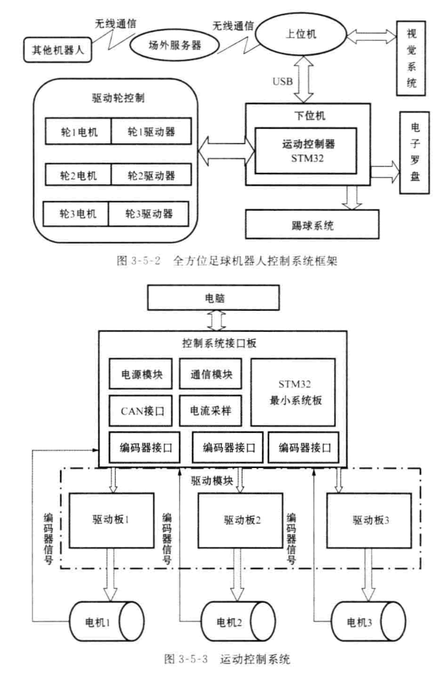 運動控制系統(tǒng)由通信模塊、電源模塊、控制模塊和電機驅(qū)動模塊組成。一塊主 控制板(STM32) 控制3塊驅(qū)動電路,分別驅(qū)動3個全方位輪,實現(xiàn)3軸聯(lián)動。當機器人工作時,通信模塊負責從PC 機接收指令數(shù)據(jù),包括3個輪子的速度和是否踢 球判斷以及踢球力度。控制模塊將3個輪子的速度發(fā)送到運動控制模塊,并產(chǎn)生 一個踢球信號控制氣動踢球系統(tǒng)產(chǎn)生踢球動作。運動控制模塊則控制著3個輪子 的速度,并且將通過閉環(huán)采集到的電機碼盤信息獲得的3個輪子的速度反饋回PC 機,供機器人上層策略算法使用。其結(jié)構圖如圖3-5-3。通信模塊和運動控制模塊的CPU采用的是 STM32F103CB。