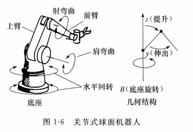 有個肩關節(jié)。在水平平面上的旋轉運動,既可 由肩關節(jié)進行,也可以繞底座旋轉來實現(xiàn)。這 種機器人的工作包跡形成球面的大部分,稱為 關節(jié)式球面機器人。
