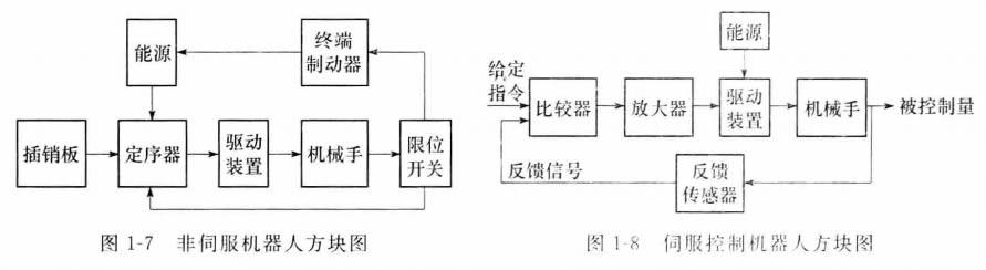 伺服控制機(jī)器人(servo-controlled robot)比非伺服機(jī)器人有更強(qiáng)的工作能力,因而價(jià)格較貴,但在某些情況下不如簡(jiǎn)單的機(jī)器人可靠。圖1-8表示伺服控制機(jī)器人的方塊圖。 伺服系統(tǒng)的被控制量(輸出)可為機(jī)器人端部執(zhí)行裝置(或工具)的位置、速度、加速度和力 等。通過反饋傳感器取得的反饋信號(hào)與來自給定裝置(如給定電位器)的綜合信號(hào),用比較器加以比較后,得到誤差信號(hào),經(jīng)過放大后用以激發(fā)機(jī)器人的驅(qū)動(dòng)裝置,進(jìn)而帶動(dòng)末端執(zhí) 行裝置以一定規(guī)律運(yùn)動(dòng),到達(dá)規(guī)定的位置或速度等。顯然,這就是一個(gè)反饋控制系統(tǒng)。