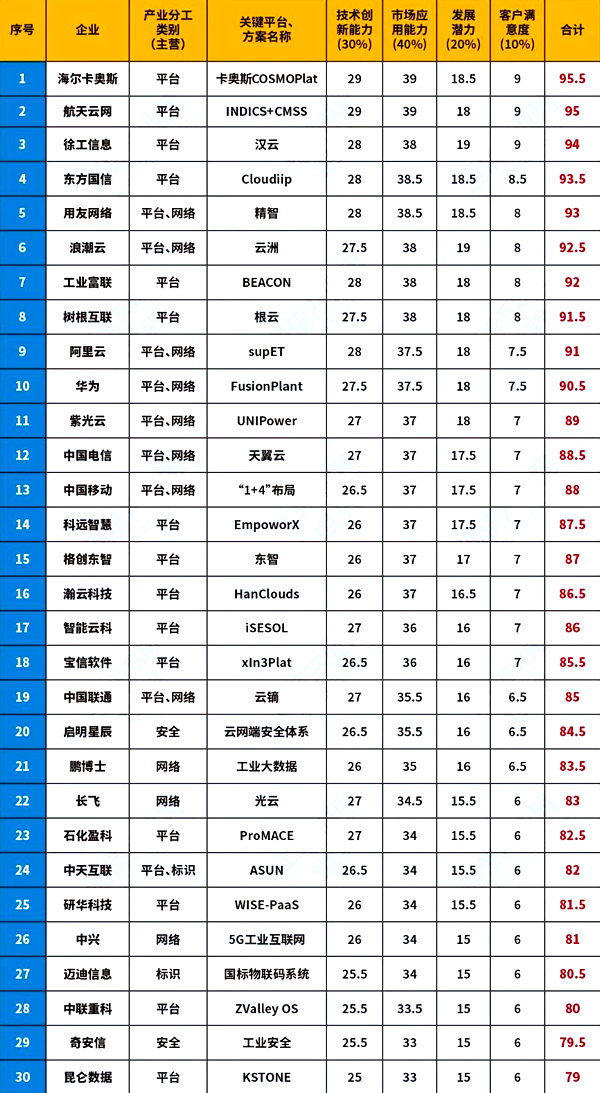 | 1 | 海爾卡奧斯 | 平臺 | 卡奧斯COSMOPlat | 29 | 39 | 18.5 | 9 | 95.5 |