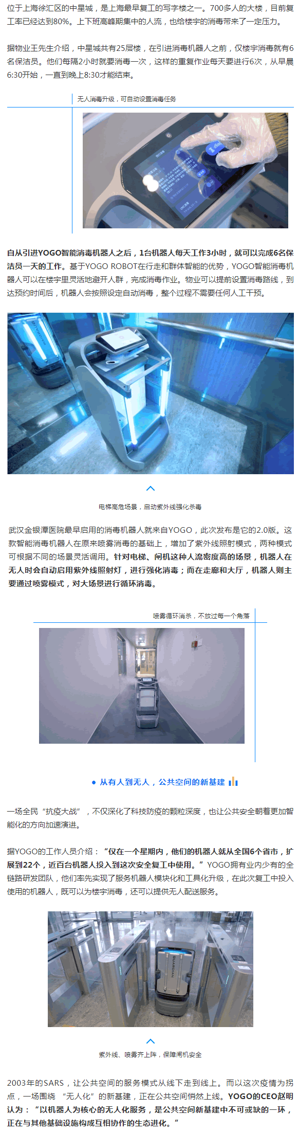 3月13日,L先的機(jī)器人企業(yè)YOGO ROBOT宣布,繼噴霧消殺機(jī)器人在疫區(qū)服役后,他們的版智能消毒機(jī)器人,也將多面投入到復(fù)工企業(yè)的日常保衛(wèi)戰(zhàn)中。