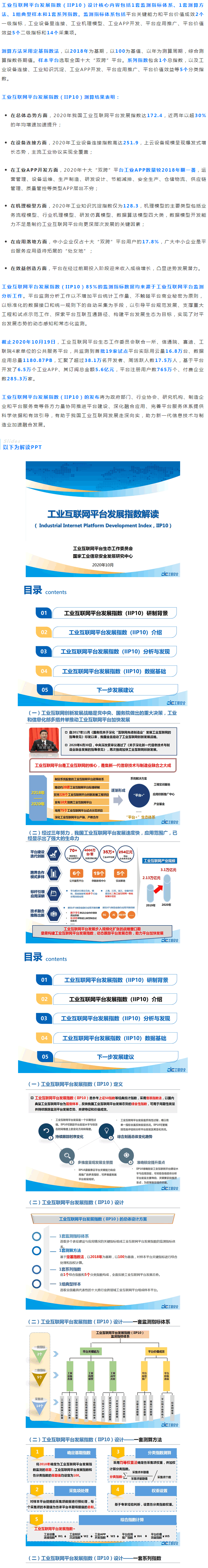 在2020年10月21日的兩化融合暨工業(yè)互聯(lián)網(wǎng)平臺大會的開幕式上,工業(yè)互聯(lián)網(wǎng)平臺發(fā)展指數(shù)(IIP10)正式發(fā)布。該指數(shù)是受工業(yè)和信息化部信息技術(shù)發(fā)展司委托研究,由工業(yè)互聯(lián)網(wǎng)平臺生態(tài)工作委員會和國家工業(yè)信息安全發(fā)展研究中心聯(lián)合研制。