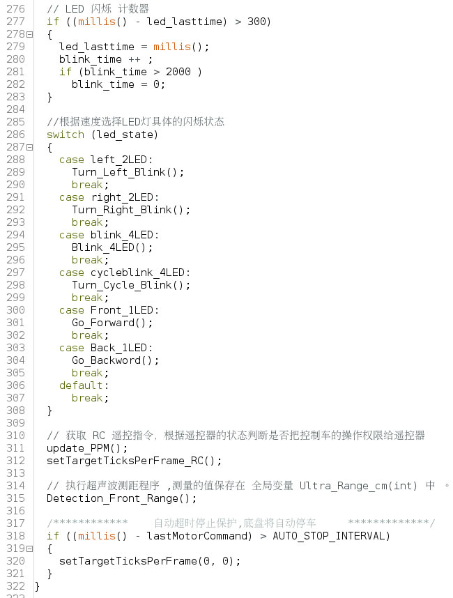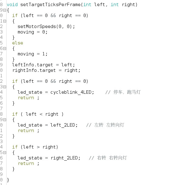 該部分代碼,說(shuō)明了LED閃爍狀態(tài)的切換方式,其切換的依據(jù)是依靠左右輪執(zhí)行的速度差來(lái)決定的。如: