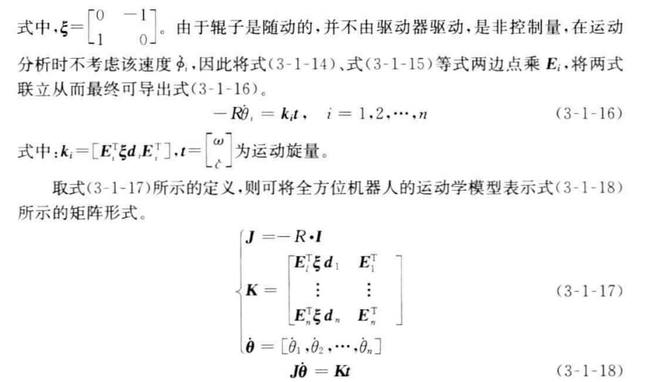 具有傳統(tǒng)車輪的機(jī)器人只能有兩個(gè)自由度的運(yùn)動(dòng),所以在運(yùn)動(dòng)學(xué)上,它等價(jià)于 傳統(tǒng)的陸上車輛。然而,具有全方位輪的機(jī)器人有3個(gè)自由度運(yùn)動(dòng)的能力,即沿著 平面上x 軸、y 軸以及繞自身中心旋轉(zhuǎn)的運(yùn)動(dòng)能力,這充分增加了機(jī)器人的機(jī)動(dòng) 性。本節(jié)將給出這種全方位移動(dòng)機(jī)器人的運(yùn)動(dòng)學(xué)模型。