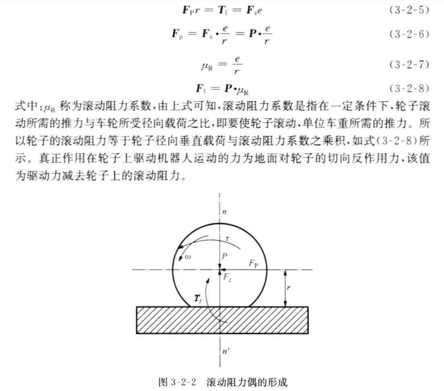 如果將法向反作用力F. 向后平移至通過輪子中心,與其垂線重合,則輪子在 地面上滾動(dòng)時(shí)的受力情況如圖3-2-2所示,出現(xiàn)一個(gè)附加的力偶矩T=F,e, 這個(gè) 阻礙車輪滾動(dòng)的力偶矩稱為滾動(dòng)阻力偶矩。由圖3-2-2可知,欲使輪子在地面上 保持勻速滾動(dòng),需要在輪軸上加一驅(qū)動(dòng)力矩r 或是加一推力Fp, 從而克服上述滾 動(dòng)阻力偶矩。相關(guān)數(shù)學(xué)關(guān)系如下所示。